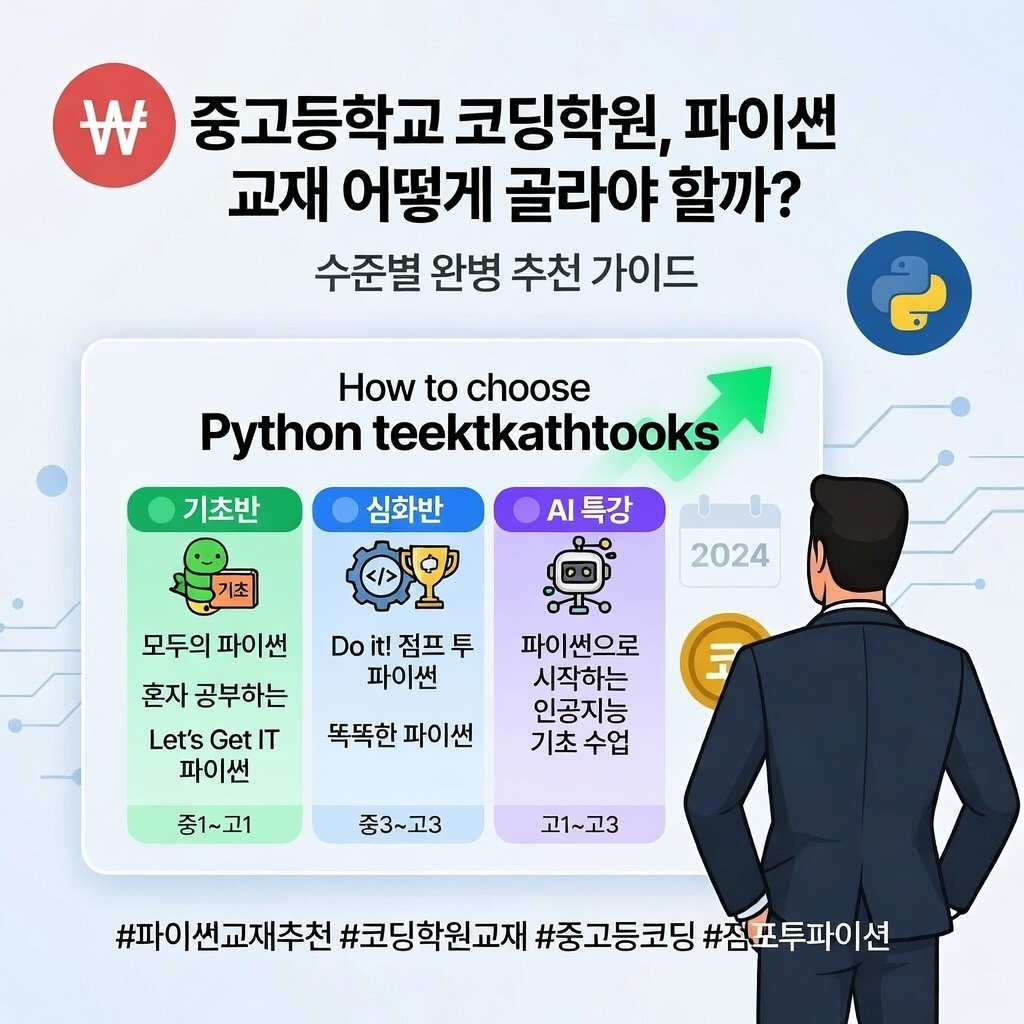안녕하세요! 오늘은 코딩학원에서 중학생·고등학생을 가르칠 때 가장 고민되는 문제, 바로 파이썬 교재 선택에 대해 이야기해 볼게요.