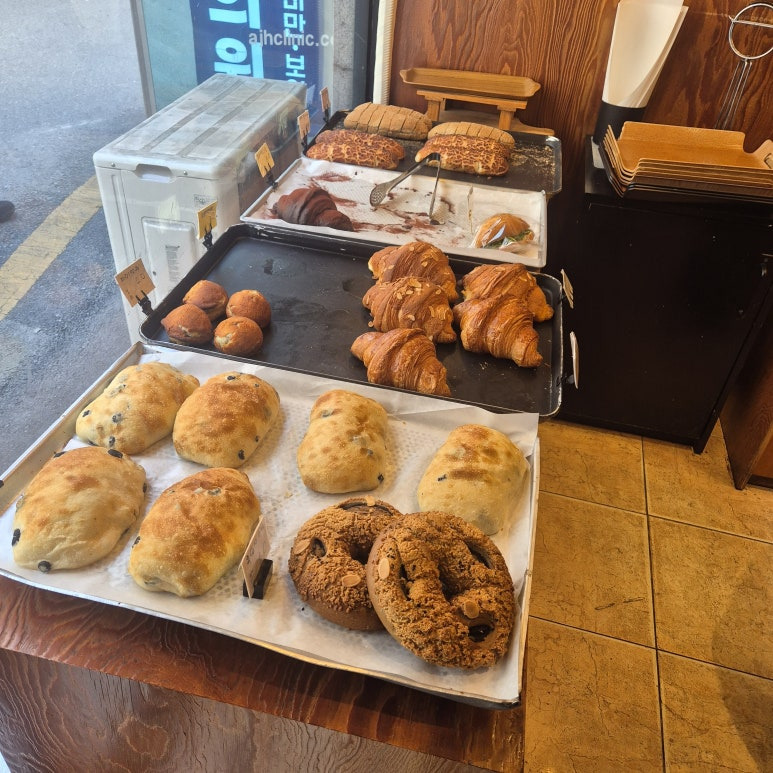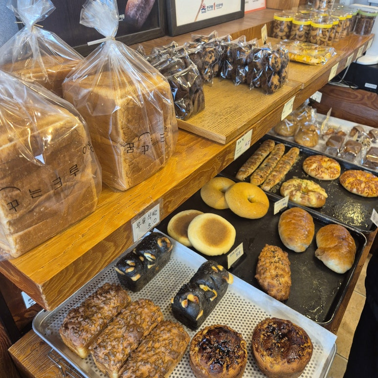 가게 안으로 들어가면 진열대 가득 다양한 빵이 눈길을 끈다. 알몬드 크루아상, 소금빵, 치즈 카페 등 기본 베이커리 라인업도 탄탄한데, 눈에 특히 띄는 건 카만테이(까만 식빵 느낌의 치즈빵)와 치즈 카페 같은 개성 있는 메뉴들이다. 우유식빵도 5,000원에 판매 중.