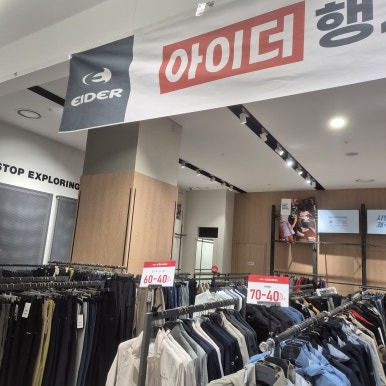아이더(EIDER) 코너도 40~70% 할인 중이었고, 아웃도어 기능성 의류 찾으신다면 들를 만 했어요.