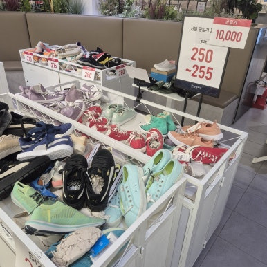 신발 코너도 규모가 꽤 있었어요. 여성 신발 250~255 사이즈 균일가 10,000원 코너도 있었고, 피팅이 맞으면 완전 득템입니다.
