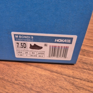 박스 확인해보니 M BONDI 9, 사이즈는 US 7.5D (한국 사이즈 255). 블랙 온 블랙 컬러라 코디하기도 편하고, 무엇보다 두툼한 미드솔이 시각적으로도 확실히 눈에 띈다.