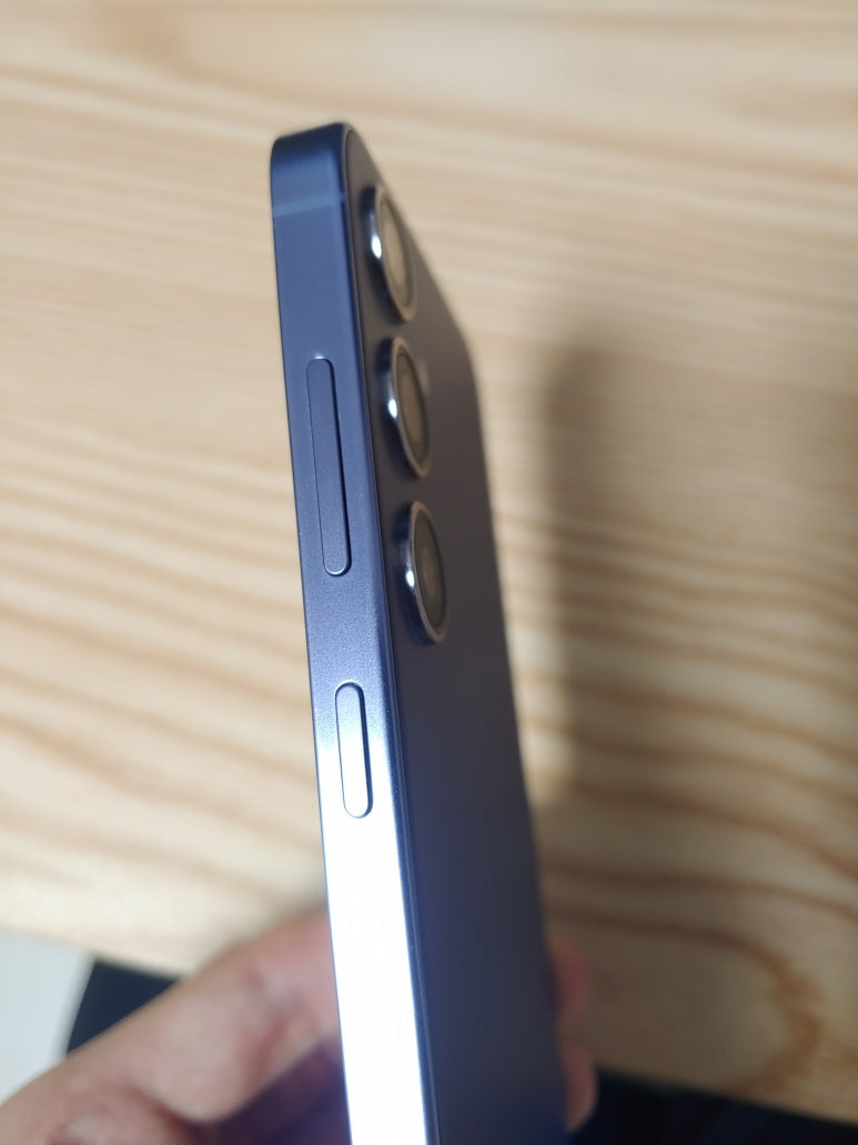 카메라 모듈도 보면 트리플 카메라 구성이 안정적으로 자리 잡혀 있다. 사진에서 보이듯 렌즈가 세 개로 나란히 배치되어 있고, 전체적인 마감도 깔끔하다. 측면 프레임도 얇고 날렵해서 전작보다 훨씬 세련된 느낌이다.
