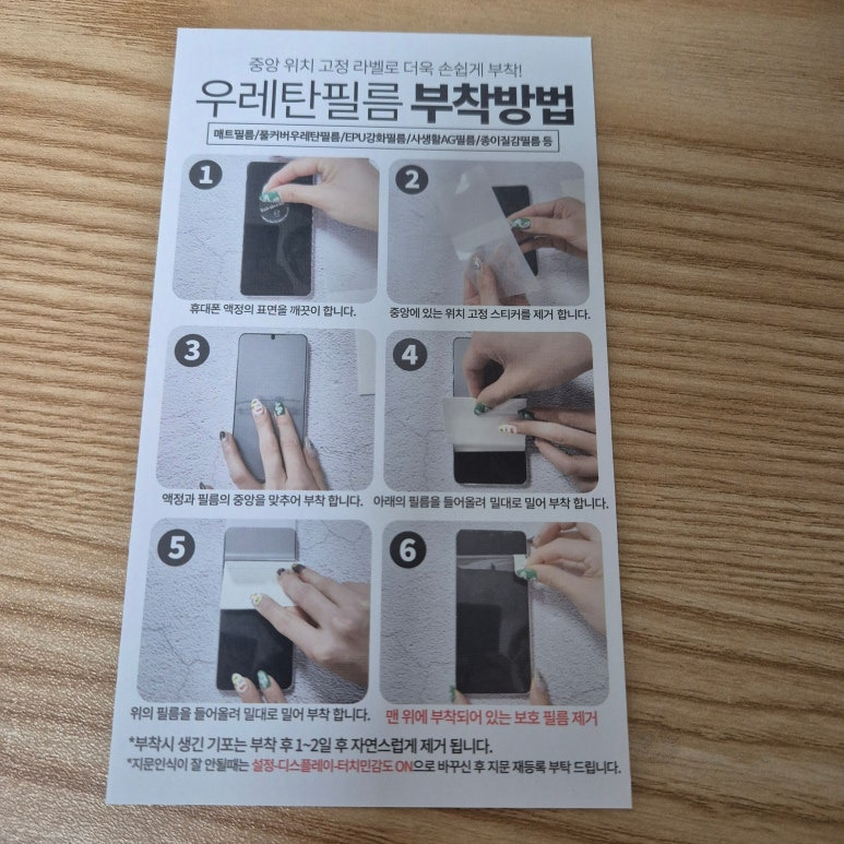 가이드 카드에 1~6단계 사진과 함께 설명이 나와 있어서 어렵지 않았다. 화면을 깨끗이 닦고, 보호 필름을 천천히 맞춰 붙이는 방식. 풀커버라 엣지 부분까지 딱 맞게 커버된다.