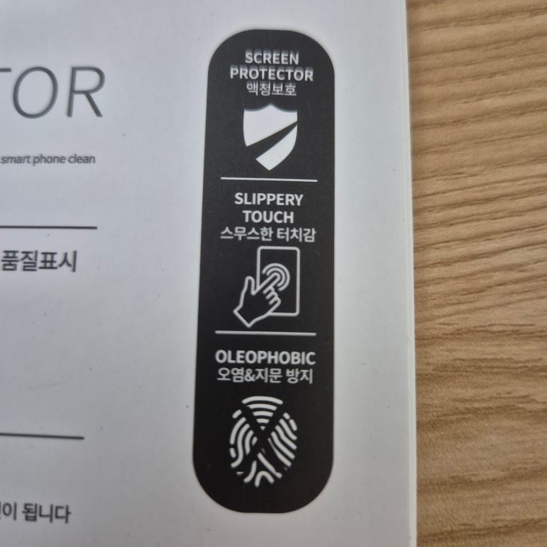 흰색 심플한 포장에 "Premium Screen Protector"라고 적혀 있고, 뒷면에는 올레오포빅 코팅, 슬리퍼리 터치 등 특성이 아이콘으로 표시되어 있다. 개봉하면 필름 3매가 들어 있고, 부착 가이드 카드도 함께 동봉되어 있어 처음 붙이는 사람도 어렵지 않게 따라할 수 있다. Made in Korea 마크도 확인.