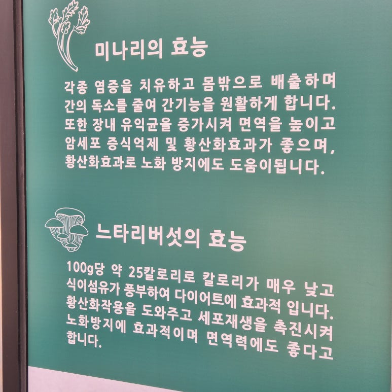 벽면에는 미나리와 느타리버섯의 효능을 소개하는 안내판이 붙어 있는데, 재료에 대한 자신감이 느껴져서 괜히 더 믿음직스럽다. 미나리는 간 기능 개선과 항산화 효과, 느타리버섯은 저칼로리 다이어트 식품으로 소개하고 있었다.
