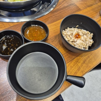 기본 반찬으로는 김치, 샐러드 등이 나왔다. 양념장은 두 가지가 제공된다. 고기와 채소를 살짝 익혀서 소스에 찍어 먹는 재미가 쏠쏠하다.