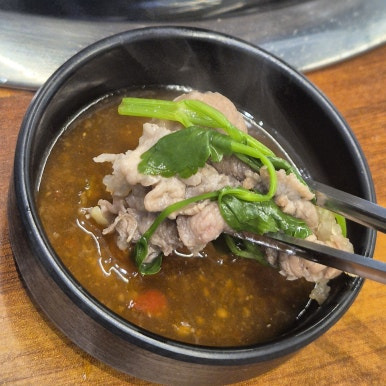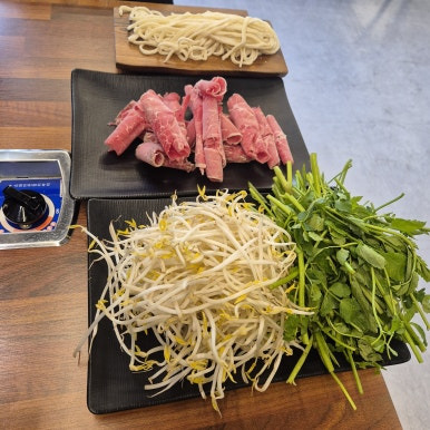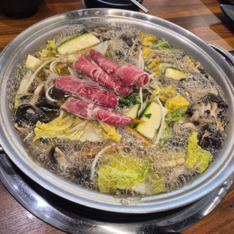 냄비에는 시원한 육수 베이스에 배추, 당근, 애호박, 느타리버섯, 목이버섯 등이 가득 담겨 나온다. 여기에 얇게 썰린 수입산 소고기, 숙주나물, 미나리를 올려 같이 끓여 먹으면 된다. 수입산이지만 마블링이 꽤 좋아 보여서 샤브용으로는 충분히 만족스러웠다.