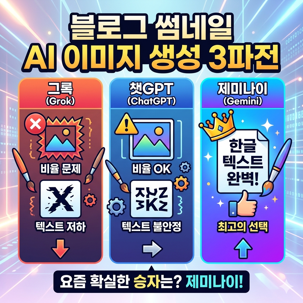 블로그 썸네일 만들 때 AI 이미지 생성 3파전 – 챗GPT vs 그록 vs 제미나이, 요즘 확실한 승자는?