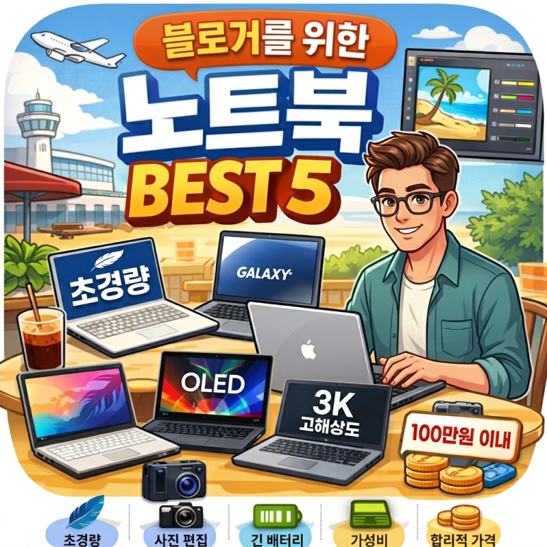 카페에서 글을 쓰고, 공항 라운지에서 사진을 정리하고, 야외에서도 바로 업로드하는 블로거에게 노트북은 단순한 사무용 기기가 아니라 ‘이동하는 작업실’에 가깝습니다. 영상 편집용처럼 아주 높은 사양까지는 아니어도, 가볍고 오래가고, 화면이 괜찮고, 가격이 너무 부담스럽지 않은 제품이 훨씬 중요하죠. 이번 글에서는 휴대성, 화면 품질, 기본 작업 성능, 가격을 기준으로 블로거에게 잘 맞는 노트북 5가지를 골라봤습니다.