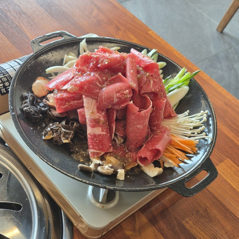 주말이라 할인 메뉴는 못 먹었지만, 대신 한우 투뿔 불고기를 주문했다. 선한 최상급 투뿔 한우로 정성껏 만든 품격 있는 불고기라는 설명이 메뉴판에 적혀 있었는데, 실제로 먹어보니 그 말이 과장이 아니었다. 단짠의 황금 비율이 딱 맞아서, 맛이 없을 수가 없는 조합이었다. 한 점 먹고 '아, 이거다' 싶었다.