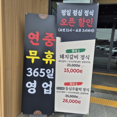 여기서 가장 중요한 포인트. 평일 점심에는 신규 오픈 기념 할인 이벤트를 진행 중이라고 한다. 돼지갈비 정식, 등심주물럭 정식 등이 믿기 힘든 가격으로 나온다는데, 주말에 방문한 나는 해당이 안 돼서 정말 아쉬웠다. 주변에 직장인이나 골프장 이용객 분들이라면 이 타이밍을 절대 놓치지 말 것. "이 가격에 이 퀄리티?" 소리가 절로 나오는 점심 맛집이 될 것 같다. 근처 직장 다니는 분들은 솔직히 매주 와도 될 것 같은 수준이다.