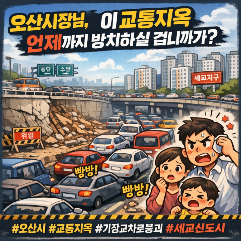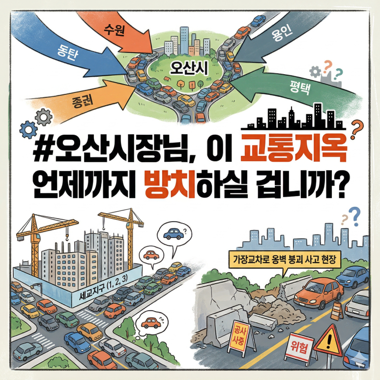오산 시민들은 작은 도시에 산다는 이유로 큰 불편을 당연하게 받아들여야 하는 것이 아닙니다. 더 이상 교통 문제가 '언젠가 나아지겠지'로 넘어가는 일이 없기를 바랍니다.