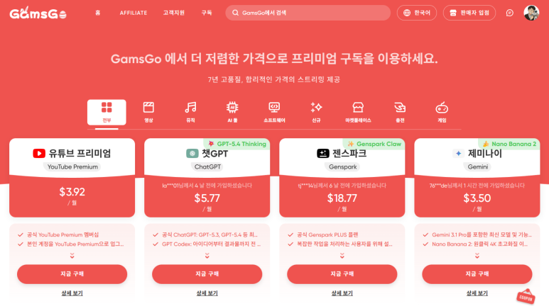 #겜스고 #GamsGo #제미나이 #제미나이Pro #AI구독공유 #생성형AI #동영상생성AI #이미지생성AI #AI툴 #챗GPT플러스 #미드저니 #구독서비스 #OTT공유 #유튜버AI툴 #블로그이미지생성 #Veo #GoogleGemini #AI활용 #콘텐츠제작AI #디지털구독