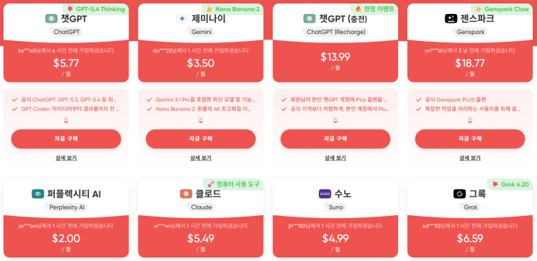 스포티파이, 디즈니플러스 같은 글로벌 OTT는 물론이고, 티빙·웨이브·왓챠 같은 한국 로컬 OTT도 있다. 그리고 내가 필요했던 것들, 즉 챗GPT 플러스, 제미나이, 클로드, 미드저니, 퍼플렉시티 AI, Grok AI 같은 최신 AI 툴도 전부 있다.