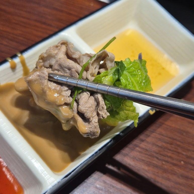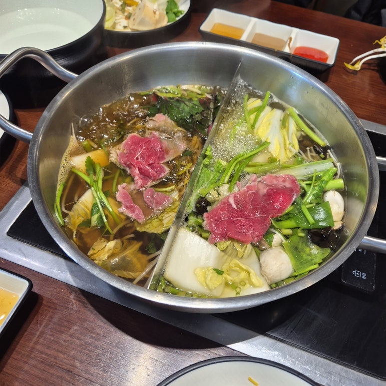 육수도 미나리 소고기 육수를 선택했는데, 향긋한 미나리 향이 국물 전체에 은은하게 배어있고 담백하면서 깊은 맛이 났다. 인공적인 향 전혀 없이 신선하고 자연스러운 풍미가 진짜 좋았음. 냄비가 두 칸으로 나눠져 있어서 미나리 소고기 육수랑 얼큰 육수 두 가지를 한 번에 맛볼 수 있었는데, 중간중간 얼큰한 거 먹다가 다시 미나리 육수로 돌아오는 그 조합이 너무 좋더라.