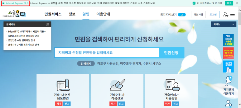 자동으로 IE 모드가 실행됩니다.