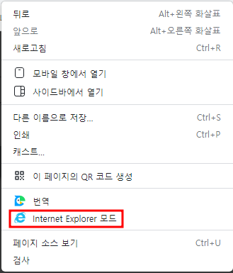 웹 페이지 -> Internet Explorer 모드가 보이네요.