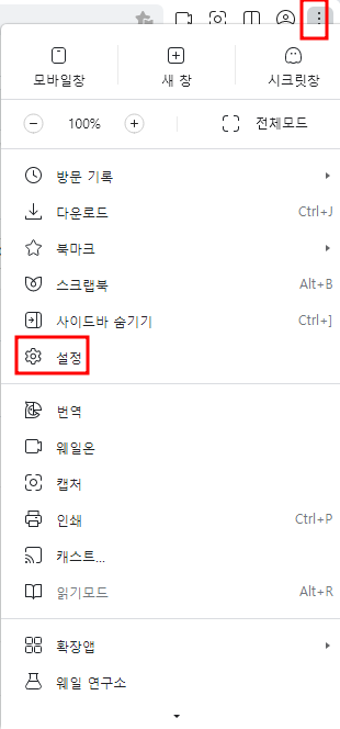 웨일 브라우저에서 메뉴 -> 설정으로 들어갑니다.