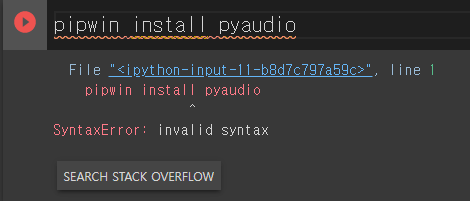 이후 일반적으로 pyaudio를 설치하기 위해선 아래의 명령어를 입력하면 된다.