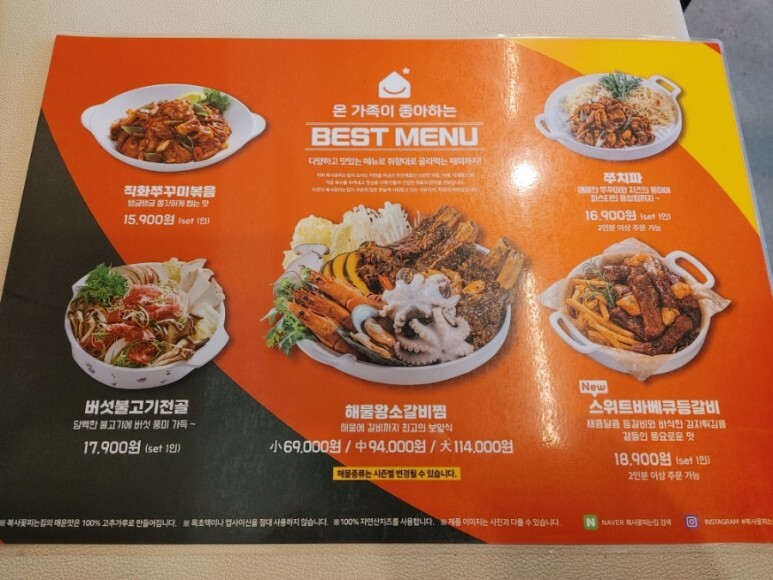 부대찌개, 직화메뉴, 전골류, 등갈비 등