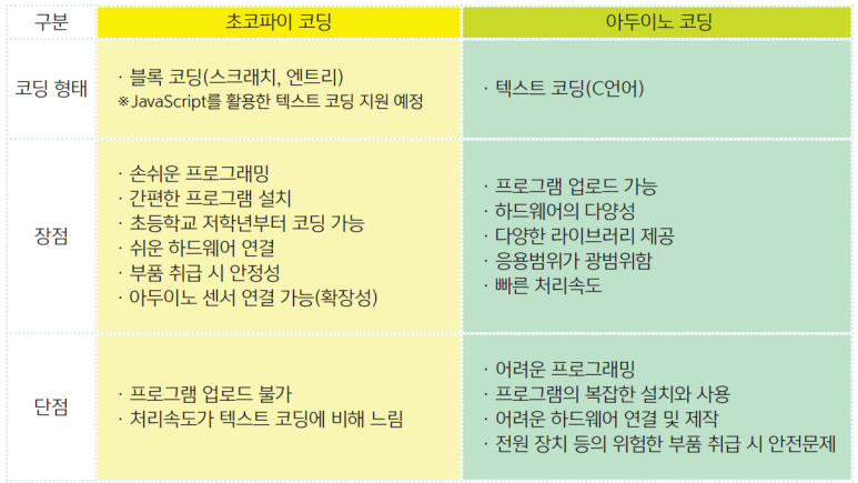 초코파이보드와 아두이노를 비교한 도표에요.