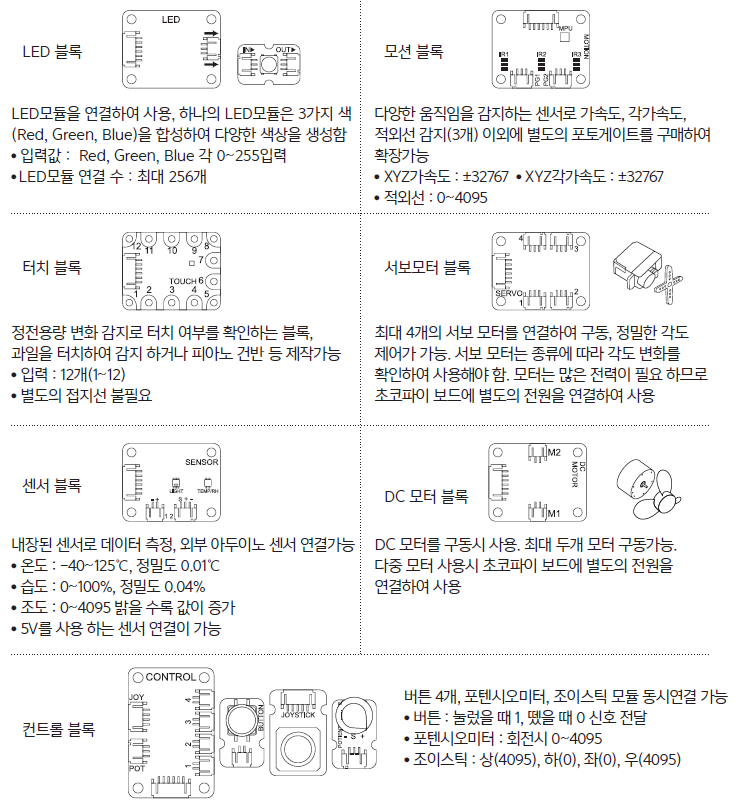 LED 블록, 컨트롤 블록, 터치 블록, 센서 블록,