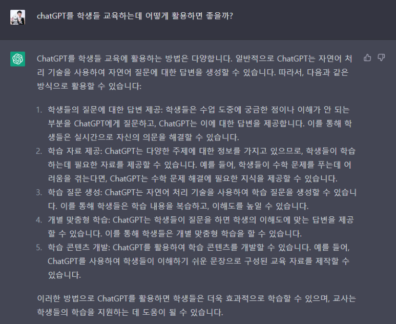 이러한 방법으로 ChatGPT를 활용하면 학생들은 더욱 효과적으로 학습할 수 있으며, 교사는 학생들의 학습을 지원하는 데 도움이 될 수 있습니다.