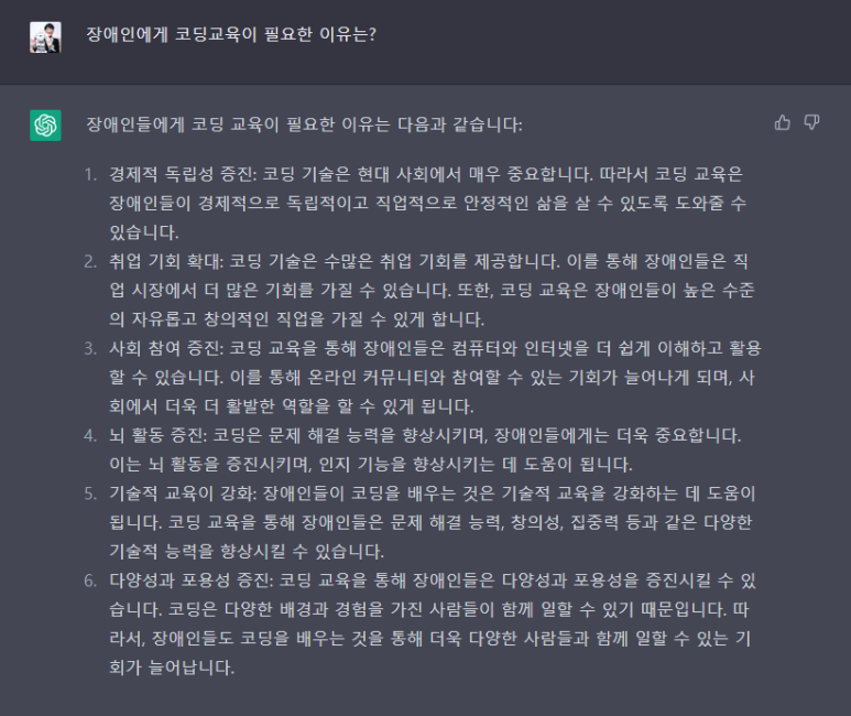 - 경제적 독립성 증진: 코딩 기술은 현대 사회에서 매우 중요합니다. 따라서 코딩 교육은 장애인들이 경제적으로 독립적이고 직업적으로 안정적인 삶을 살 수 있도록 도와줄 수 있습니다.