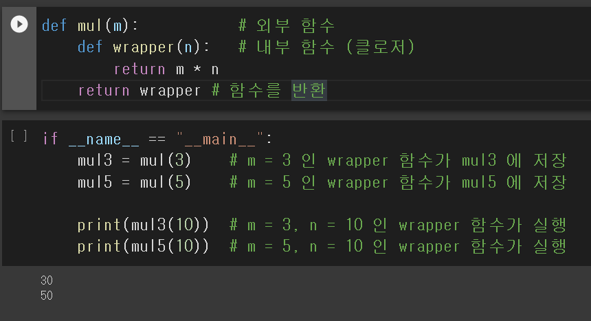 mul3(10)을 호출하면 m=3, n=10인 wrapper 함수가 실행되어 30을 반환합니다. 마찬가지로 mul5(10)을 호출하면 m=5, n=10인 wrapper 함수가 실행되어 50을 반환합니다.