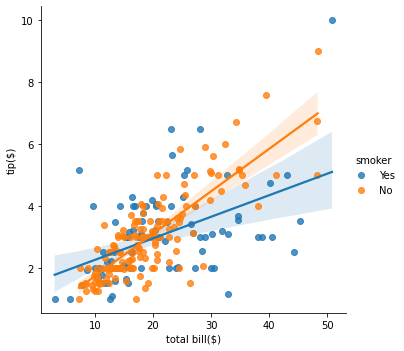 Finally, you created a scatter plot with a linear regression line for the total bill and tip amount, with the points colored by whether the customer was a smoker or not. You labeled the x-axis as "total bill($)" and the y-axis as "tip($)".
