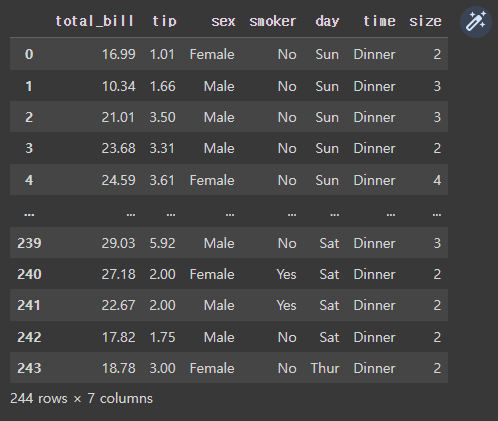 전반적으로 이러한 시각화를 통해 팁 금액의 분포와 팁데이터 데이터 프레임의 다른 변수와의 관계를 잘 파악할 수 있습니다.