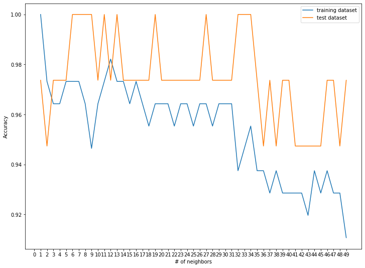 plt.xlabel("# of neighbors")