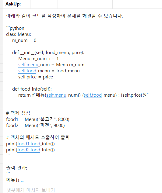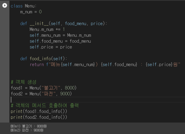 class Menu: m_num = 0 def __init__(self, food_menu, price): Menu.m_num += 1 self.menu_num = Menu.m_num self.food_menu = food_menu self.price = price def food_info(self): return f"메뉴{self.menu_num}) {self.food_menu} : {self.price}원" # 객체 생성 food1 = Menu("불고기", 8000) food2 = Menu("파전", 9000) # 객체의 메서드 호출하여 출력 print(food1.food_info()) print(food2.food_info())