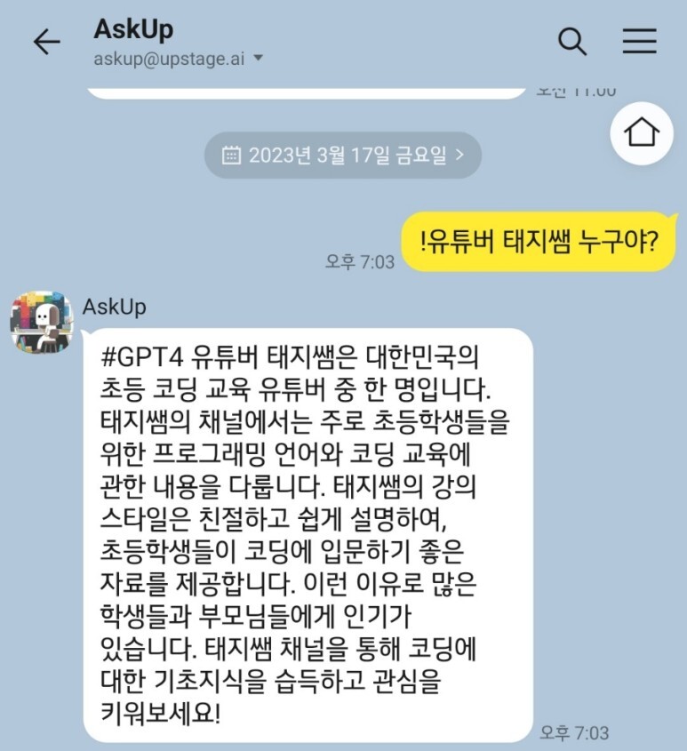 그런데 이번에 AskUp에 GPT4가 적용되었다고해요.