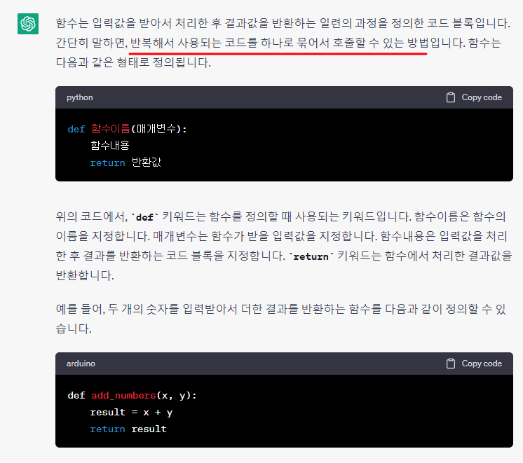 위의 코드에서, `def` 키워드는 함수를 정의할 때 사용되는 키워드입니다. 함수이름은 함수의 이름을 지정합니다. 매개변수는 함수가 받을 입력값을 지정합니다. 함수내용은 입력값을 처리한 후 결과를 반환하는 코드 블록을 지정합니다. `return` 키워드는 함수에서 처리한 결과값을 반환합니다.