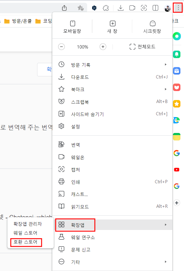 네이버웨일브라우저에서 -> 확장앱