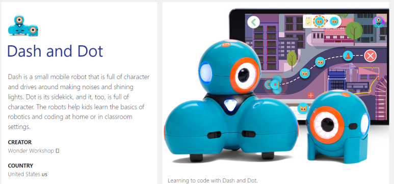 * 원더 워크샵 대쉬와 닷: 이 두 로봇은 모든 연령대의 어린이에게 안성맞춤입니다. 대시는 모든 종류의 재미있고 교육적인 프로젝트를 만드는 데 사용할 수 있는 프로그래밍 가능 로봇이며, 닷은 게임과 도전을 통해 아이들에게 프로그래밍의 기초를 가르쳐주는 코딩 로봇입니다.