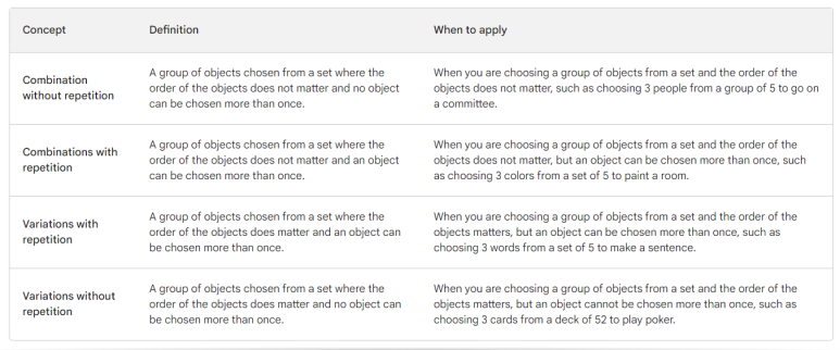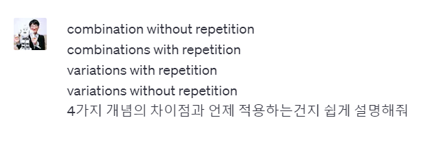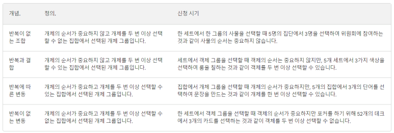 따라서, 이 네 가지 개념은 서로 다른 선택과 구성의 방법을 나타내며, 데이터 분석, 확률, 통계 등에서 자주 사용됩니다. 이를 간단히 요약하면 다음과 같습니다.