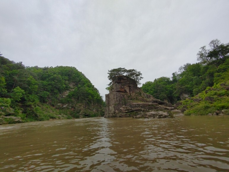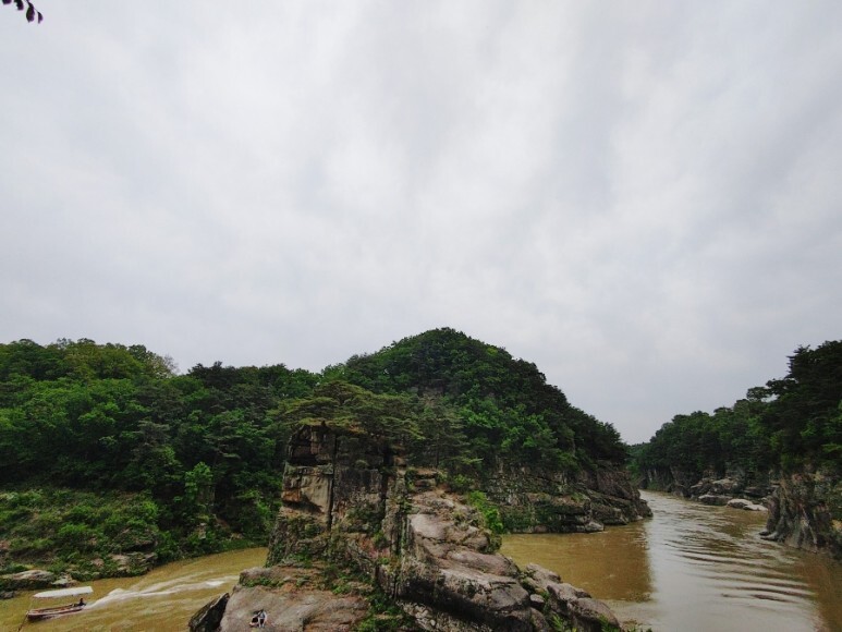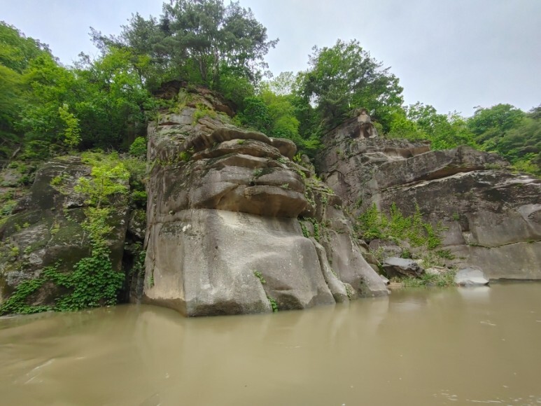 한탄강 협곡에 홀로 우뚝 서 있는 화강암 바위와