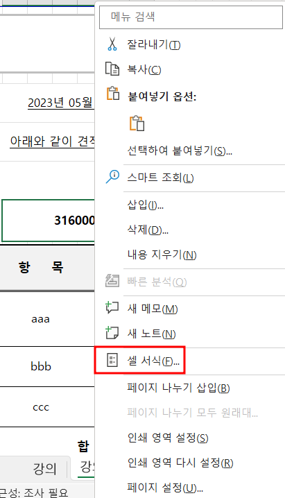 마우스 우클릭하면 셀 서식 메뉴가 생겨요.