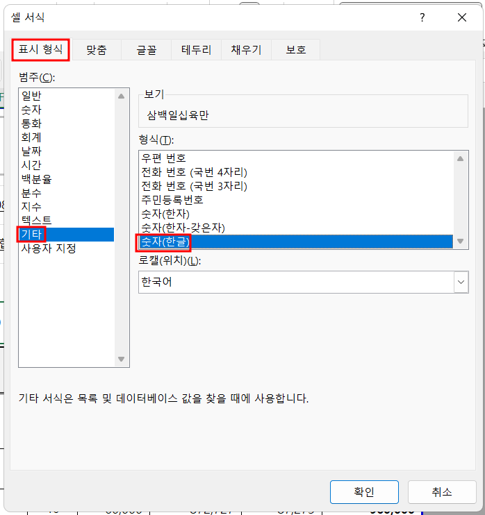 표시 형식 -> 기타 -> 형식(숫자(한글)을 선택해요.