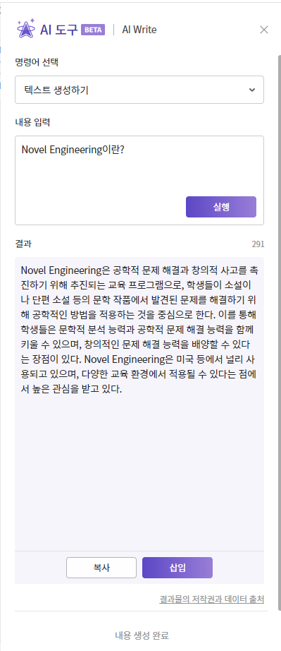 바로 AI가 생성한 문장이 작업하던 문서에 삽입됩니다.
