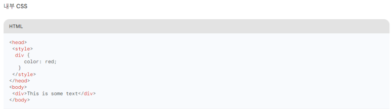 - 내부 CSS 는 HTML 문서의 헤더 섹션에 포함된 CSS 스타일 시트입니다. 내부 CSS는 <style> 태그로 래핑됩니다.