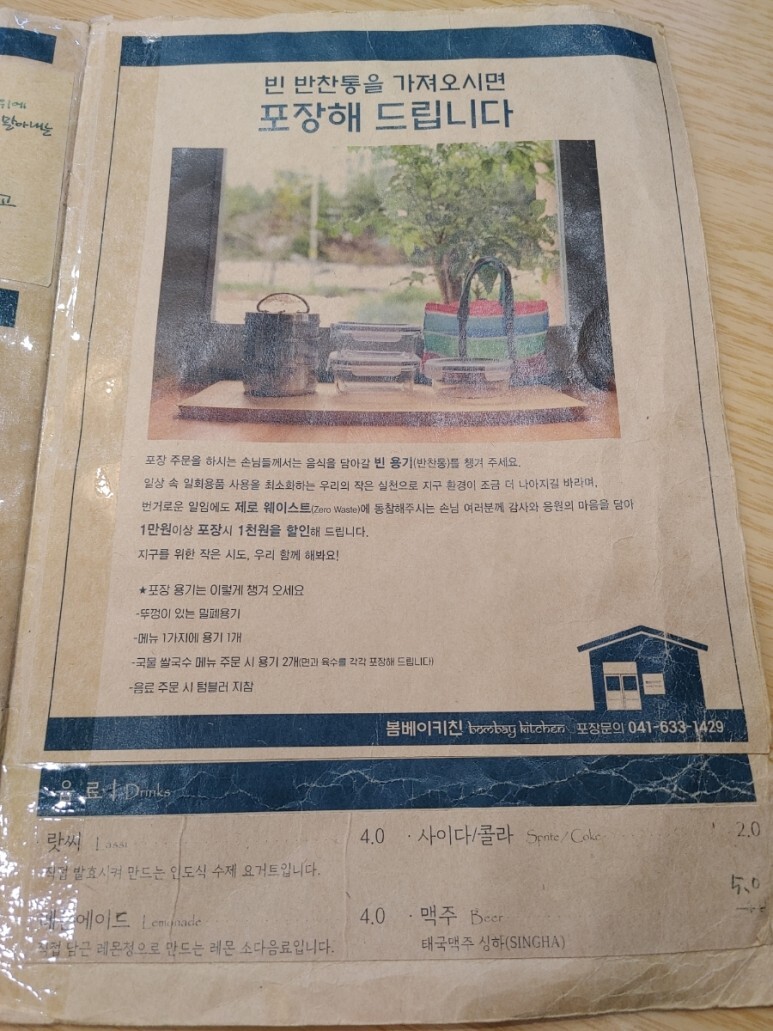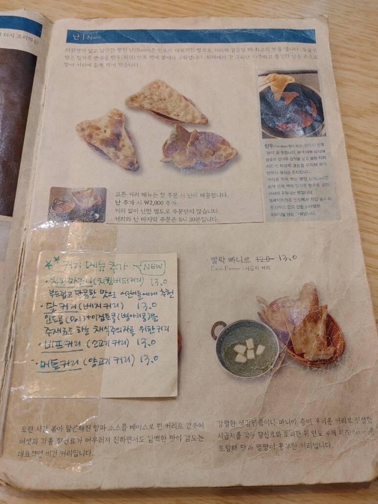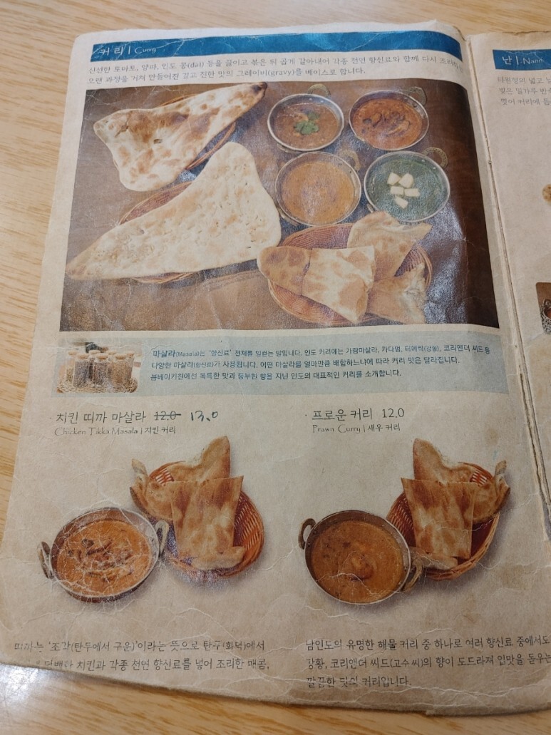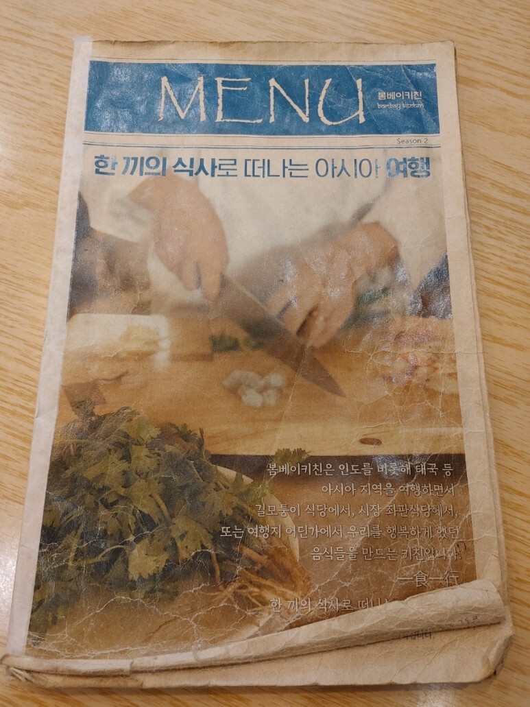 이게 바로 봄베이키친의 메뉴판이에요.
