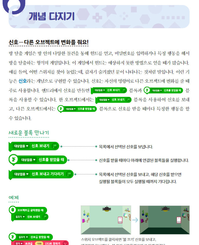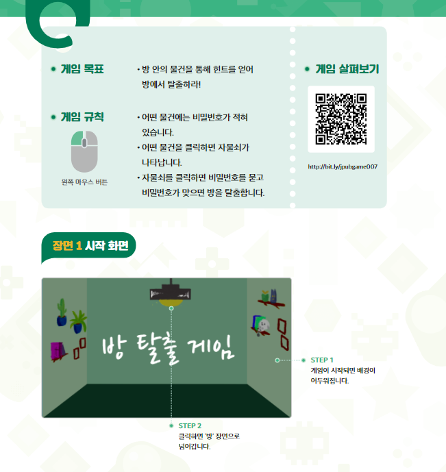 아래는 스크래치를 활용하여 만들 수 있는 방탈출 게임의 예시 기획서입니다. 이 기획서를 참고하여 원하는 방탈출 게임을 만들어보세요.