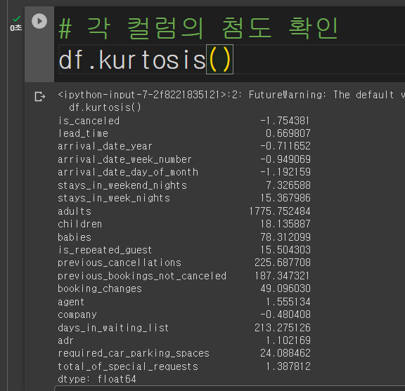 첨도는 데이터 분포의 뾰족한 정도를 나타내는 지표입니다. 첨도 값이 0보다 크면 데이터 분포는 정규분포보다 더 뾰족한 모양을 갖게 되며, 이를 급첨된 분포라고 합니다. 반대로 첨도 값이 0보다 작으면 데이터 분포는 보다 완만한 모양을 갖게 되며, 이를 평평한 분포라고 합니다. 첨도는 데이터 분포의 꼬리 부분에 대한 정보를 제공하며, 데이터의 이상치 여부나 예외적인 사건이 발생할 가능성을 추론하는 데에 도움이 됩니다. 예를 들어, 주식 시장의 수익률 데이터 분포가 급첨된 분포를 갖는다면, 주식 시장에서 극단적인 수익률 사건이 발생할 가능성이 높다고 해석할 수 있습니다.