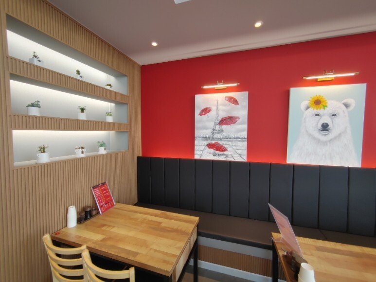강렬한 붉은 간판이 매달려있어요.