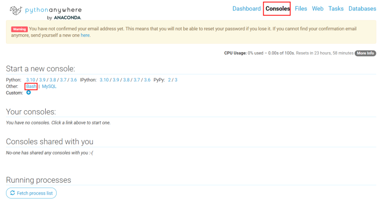 consoles에서 Bash를 선택해요.