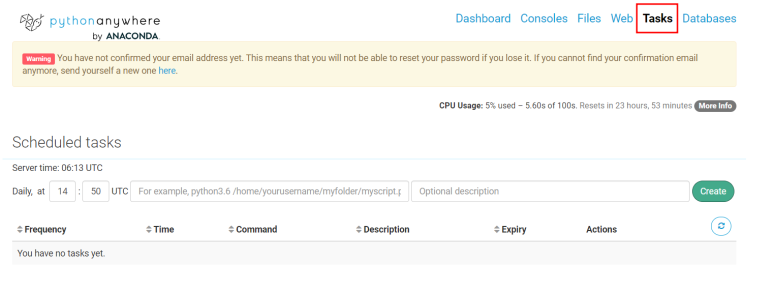 python anywhere의 Tasks 메뉴에서