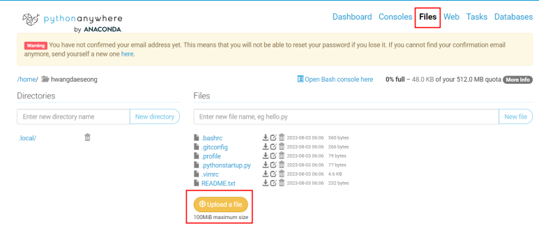 서비스 이용을 위해 python anywhere에 로그인하구요.